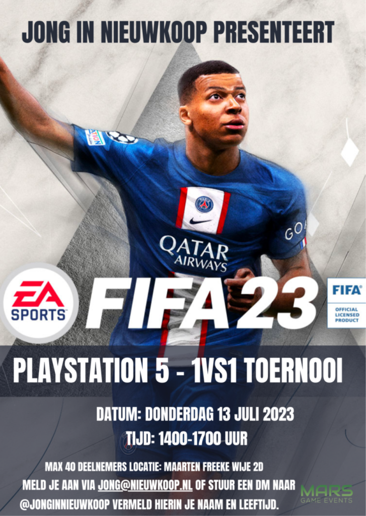 Gamers en voetballiefhebbers opgelet: op 13 juli organiseert Jong in Nieuwkoop in samenwerking met Marsevents een FIFA 23 toernooi! Op deze dag plaatsen wij in ons Wijkpunt (Maarten Freeke Weije 2D) meerdere schermen en PlayStation 5 consoles met FIFA 23.